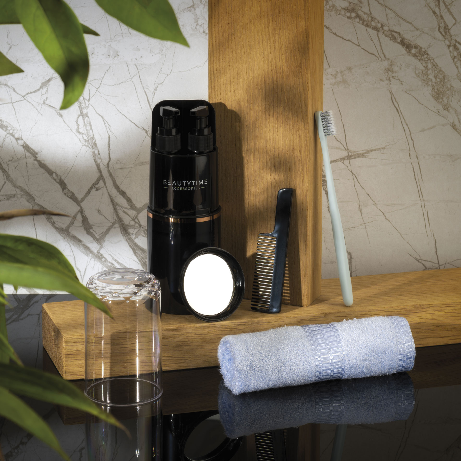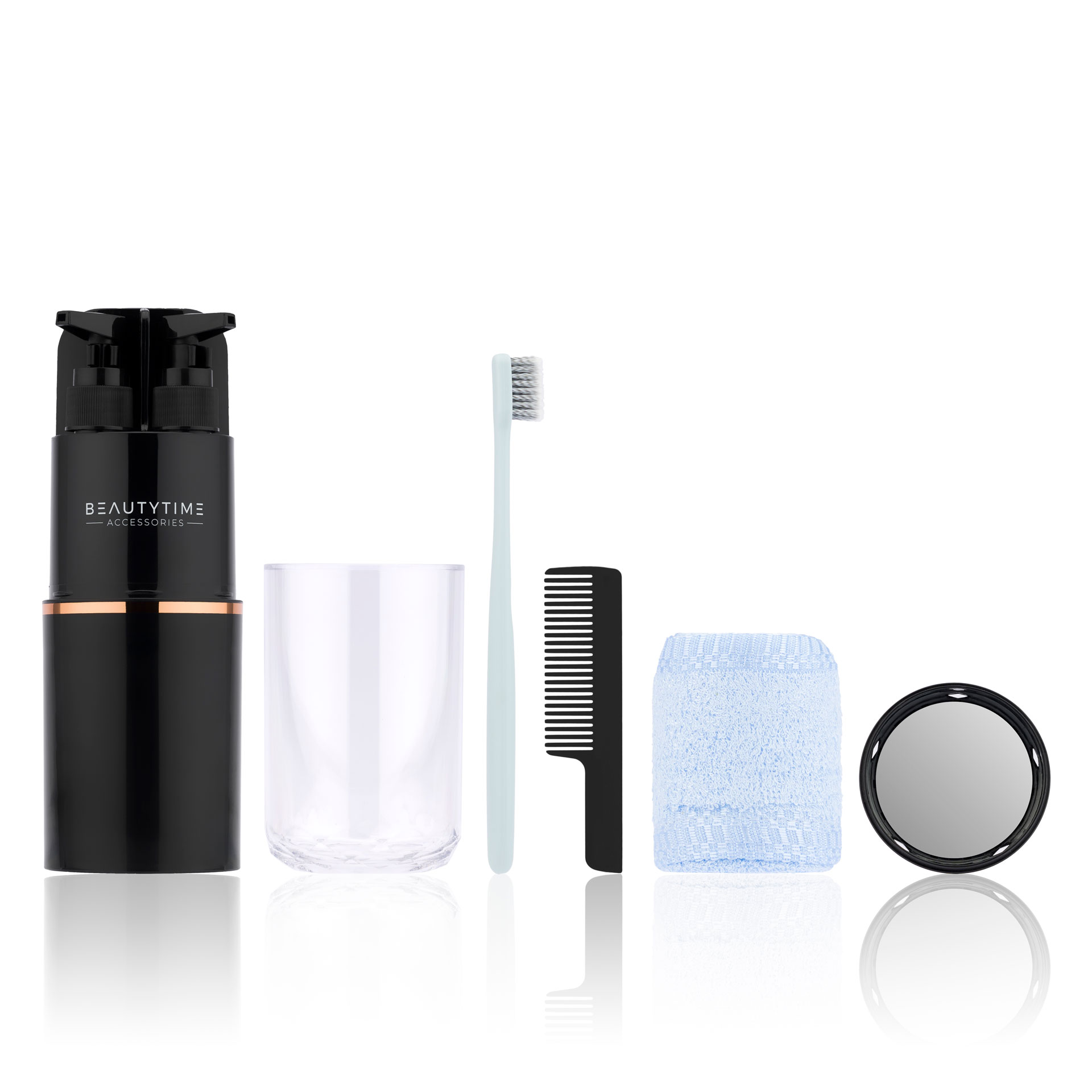 Il set è composto da: > 2 dispenser da 50 ml cad. > 1 spazzolino da denti e relativo spazio vuoto per inserire il tubetto di dentifricio > 1 tazza trasparente > 1 pettine > 1 asciugamano 30x35 cm > 1 specchio