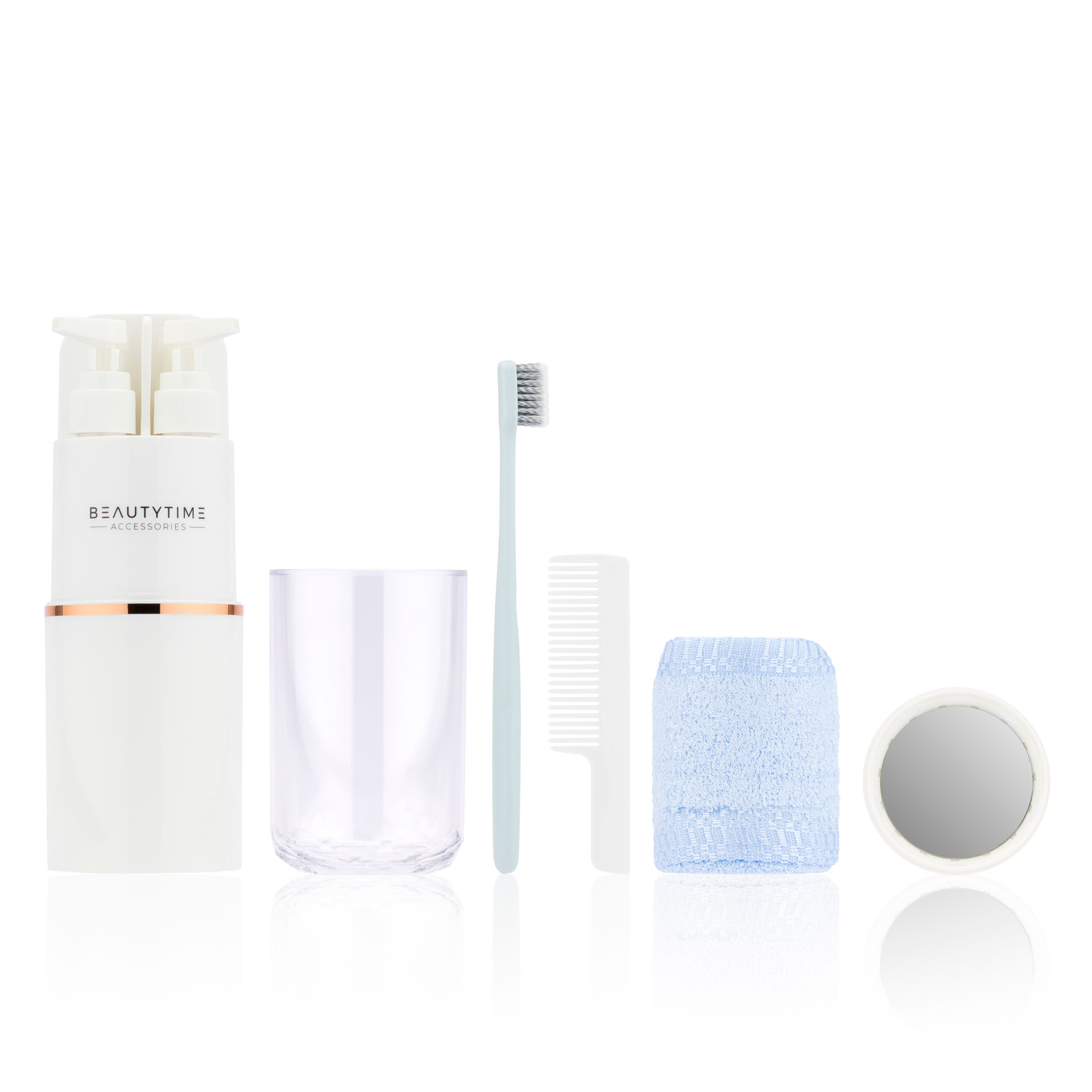 Il set è composto da: > 2 dispenser da 50 ml cad. > 1 spazzolino da denti e relativo spazio vuoto per inserire il tubetto di dentifricio > 1 tazza trasparente > 1 pettine > 1 asciugamano 30x35 cm > 1 specchio
